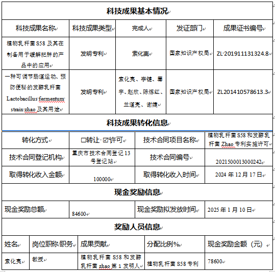 现金奖励公示[2024]2号—关于索化夷科研团队科技成果转化奖励的公示