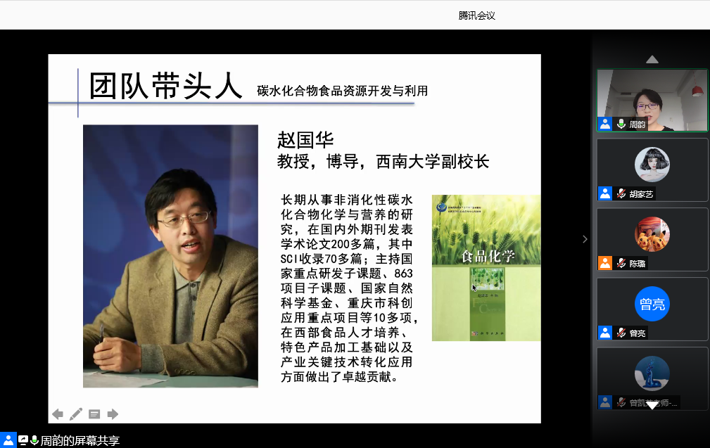 紧接着,周韵副教授、陈栋副教授、刘雄教授、陈应娟副教授、戴宏杰老师、曾凯芳教授、钟耕教授、明建教授依次就碳水化合物食品资源开发与利用、肉类科学与川菜工程技术、特色调味品资源开发与品质调控、茶与特色资源高效利用、食品蛋白质资源高值利用及食品安全监测与主动防控、食品贮藏与物流、西南地区特色植物多糖功能性食品创制、植物多酚营养与健康等研究团队及实验室资源等进行了全面详实的介绍,使同学们对老王磁力