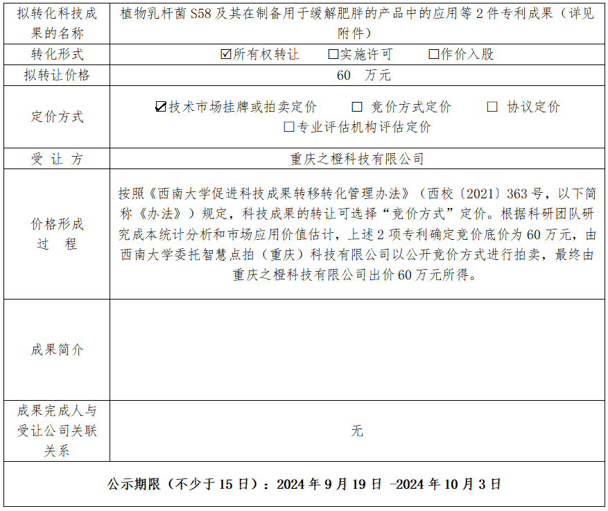 促进科技成果转移转化管理办法》(西校〔2021〕363 号)文件精神,规范职务科技成果转化相关信息公开、透明,现对以下拟转化的科技成果相关信息公示如下: