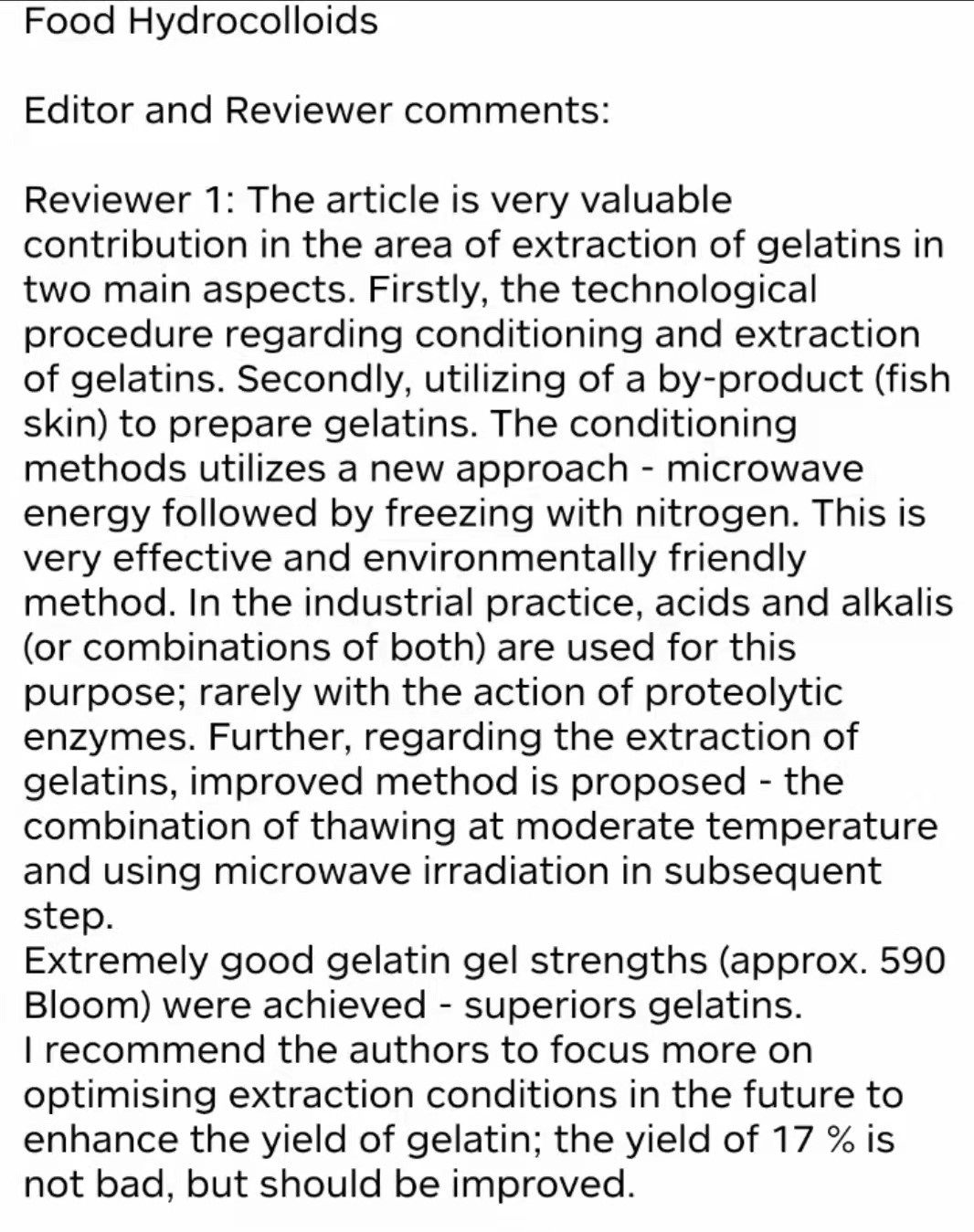 该技术已授权国家发明专利(一种鱼皮明胶制备方法及产品,ZL 2018 1 1457417.5),并于20223月在在食品领域TOP期刊《Food Hydrocolloids》以“A green extraction method for gelatin and its molecular mechanism”为题,发表学术论文。国际业内专家对该项技术的研发给予了高度肯定,认为这项技术的研发对于鱼皮高值利用和解决明胶产业污染问题方面做出了很有价值的贡献。