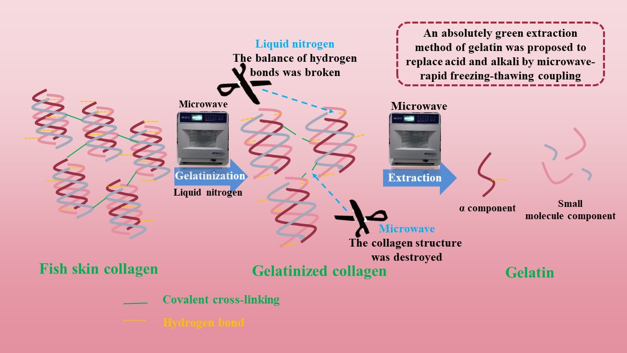 明胶生产是鱼皮有效利用的主要领域之一,由于低成本,无毒以及高生物安全性等优势,被广泛应于食品,制药以及化妆品等领域。但因传统的酸碱法制备鱼皮明胶耗费大量的水、时间和能源,并且产生大量废水,严重影响生态环境,已经导致我国明胶产业逐年萎缩。川渝共建特色食品重庆市重点实验室张宇昊教授团队研发了微波快速冻融耦合技术,完全实现了明胶的绿色生产。