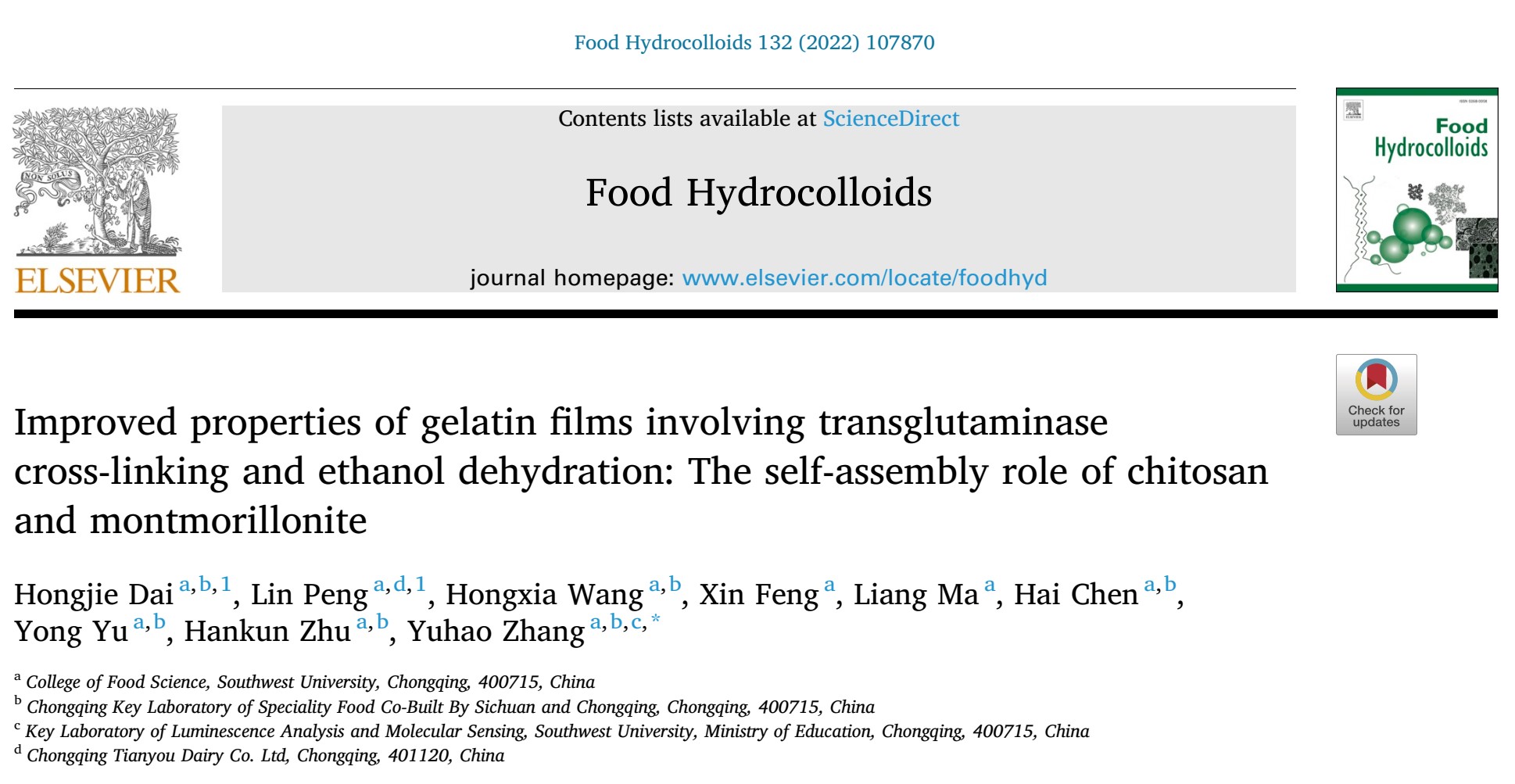 张宇昊教授课题组在明胶膜制备领域取得系列进展,相关成果以论文发表在SCI一区期刊Food Chemistry、Food Hydrocolloids。