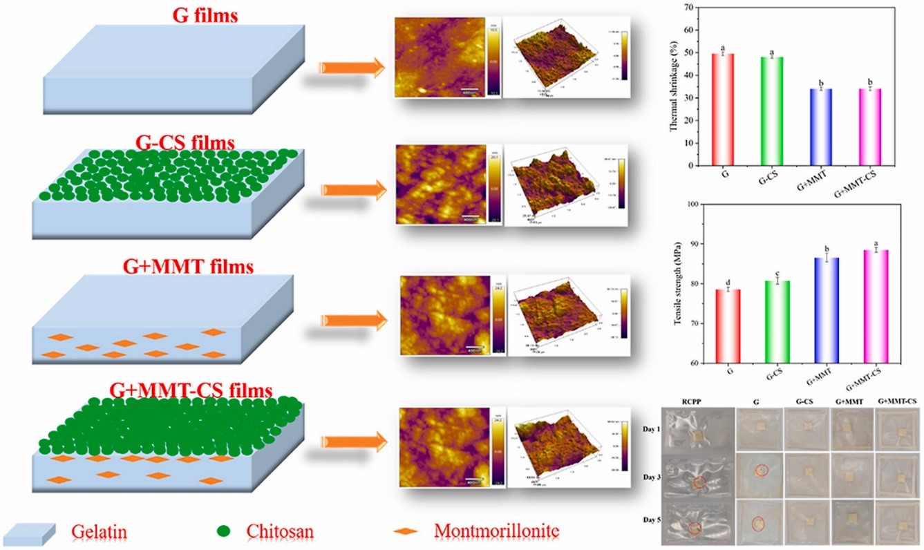 近日,该团队通过引入蒙脱土和自组装壳聚糖对明胶膜的热稳定性和亲水性能进行调控和改善,取得重要进展。相关研究以论文“Improved properties of gelatin films involving transglutaminase cross-linking and ethanol dehydration: The self-assembly role of chitosan and montmorillonite”发表在SCI一区期刊Food Hydrocolloids。
