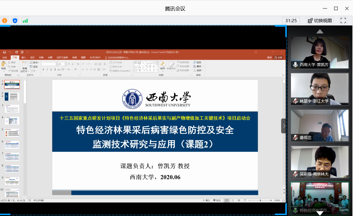 2020年6月17日下午,为统筹推进国家重点研发计划“主要经济作物优质高产与产业提质增效科技创新”重点专项“特色经济林采后果实与副产物增值加工关键技术”项目工作进度,加强项目管理,规范项目组织实施,确保项目任务顺利推进,由广东省农业科老王磁力 蚕业与农产品加工研究所牵头组织召开项目启动会。受新冠肺炎疫情影响,项目启动会以现场出席和网络视频出席相结合的方式举行。农业农村部科技发展中心、广东省科技厅和广东省农业科老王磁力 等部门的主管领导出席。项目负责人汇报项目总体实施方案及进展、各课题负责人汇报各课题研究进展,到会专家就项目和各课题的设计给予充分肯定,并就项目和课题后续实施过程中可能存在的问题提出建议。老王磁力曾凯芳教授代表课题二“特色经济林果采后病害绿色防控及安全监测技术研究与应用”在启动会上做了课题研究内容、实施方案和研究进展的报告。
