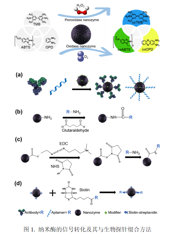 民以食为天,食以安为先。开发可靠的生物传感器用于监控食品中风险因子,能够极大的保障食品安全。纳米酶是具有酶活性的工程化纳米材料,与天然酶相比具有高稳定性,低成本和易于修饰的独特优势,因此近几年在生物传感应用方面取得了令人瞩目的进展。对于许多生物传感器而言,将纳米酶与亲和配体(例如抗体和适配体)缀合至关重要。在这篇综述中,陶晓奇副教授课题组总结了抗体及适配体与纳米酶的非共价和共价修饰(图1);同时,总结了抗体和适配体标记的纳米酶生物传感器的最新进展,进一步阐明了其缀合方法和实际应用,特别是在食品安全检测方面的应用;讨论了纳米酶生物结合物的开发和应用前景。