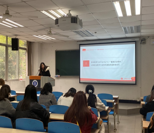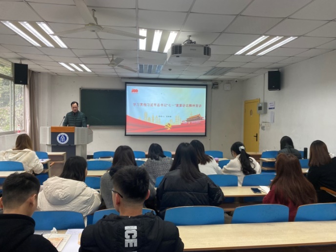 首先,夏杨毅老师就学习贯彻习近平总书记“七一”重要讲话精神进行宣讲,旨在让同学们深刻认识、准确把握习近平总书记“七一”讲话的重大意义。夏老师提到,讲话是一篇马克思主义中国化的纲领文献、是新时代中国共产党人不忘初心、牢记使命的政治宣言、是中国共产党牢记使命、开创美好未来的时代答卷、是科学指引我们党和全国各族人民开创千秋伟业的行动纲领。通过夏老师的悉心讲解,同学们深切意识到习近平总书记“七一”重要讲话是一篇闪烁着马克思主义真理光芒的光辉文献,充分展示了中华民族正以不可阻挡的步伐迈向伟大复兴的光明前景。支部全体成员备受鼓舞,立志在党和人民的事业中不懈奋斗,不负时代,不负韶华,不负党和人民的期望,始终牢记初心使命、开创美好未来。