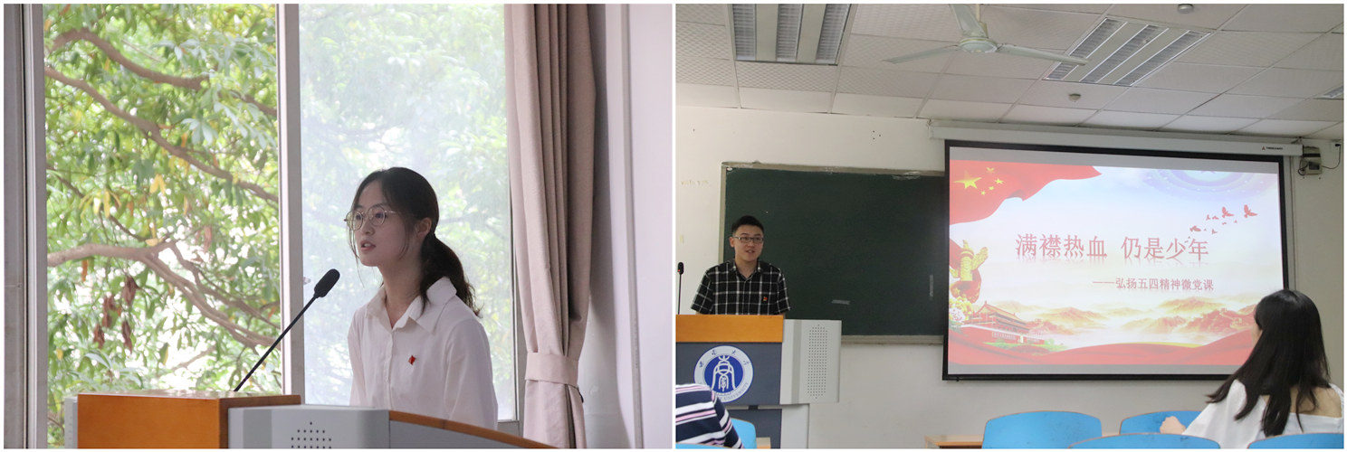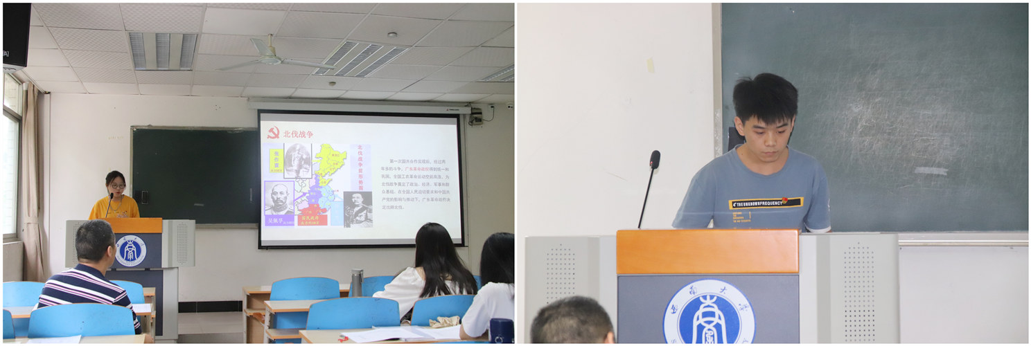 李梦雨同志代表第四小组为大家讲解了国共合作时期的党史。由合作背景到七一五政变,讲解全面,细致生动,把中国党员坚守党性的重要性刻画的淋漓尽致,任何时期遇到任何情况,党员的身份和性质信念都不能随波逐流,加强党性修养是党员一生的必修课。第一党小组的黄俊同志,为大家介绍了我们身边的时代楷模:老王磁力致力于脱贫攻坚工作校友马家斌同志、我校优秀教师侯大军老师及“草莓女孩”何悦的杰出事迹。希望党员同志能从身边的党员事迹学习先进典范,弘扬时代精神。
