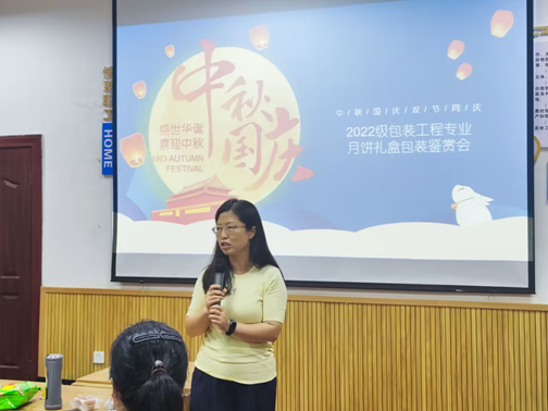 2022级包装工程专业月饼礼盒赏鉴会于线下拉开序幕。本次活动在39教创客空间举行,由22级包装一班班长苏提森主持。出席本次活动的成员有包装工程系徐丹主任,班主任黎盛和任丹老师,以及2022级包装工程专业全体学生。