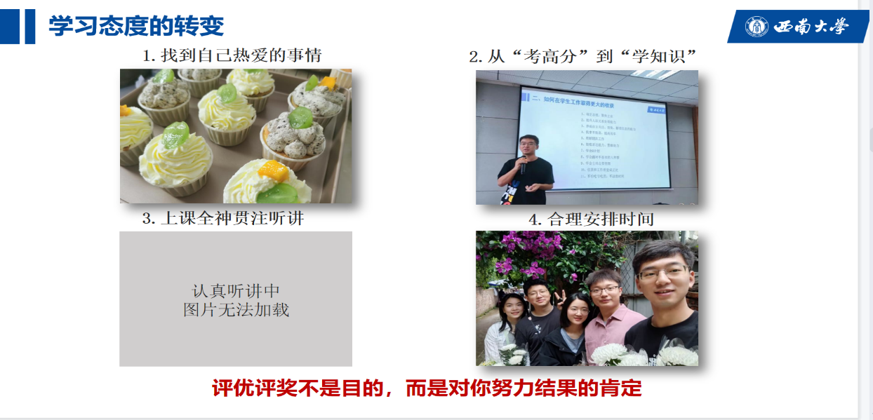 活动开始,张书敏从个人学习、学生工作、科研与竞赛三个方面分享了自己的大学经历,并重点对评优评奖,“百超”班选拔,科研经历等方面进行了介绍,鼓励同学们要重视学习,端正学习态度,积极参加各项活动,不畏惧失败,牢记所有的失败与尝试都是成功的开始。