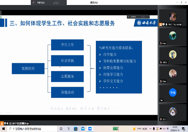 的保研政策、保研条件,特别强调了保研注意事项,为低年级同学带来了一场实用的“保研”启蒙课、答疑课;张海瑶、王一州、史文婧则将自己成功上岸、成功留学的经验毫无保留的分享给同学们,为正在备考的同学指明了复习的方向,也避免了“踩坑”;张艳、金蝶则以自己为案例,从多个维度为同学们疏导就业压力、增强求职技能;胡明丽、陈威洋、李兴洲用生动幽默的语言将自己在“考公”方面的高分经验一一传授给大家。针对以上内容,同学们在认真笔记的同时也积极思考、主动提问,与相应的分享人进行了深入的交流,线上提问同步也进行。