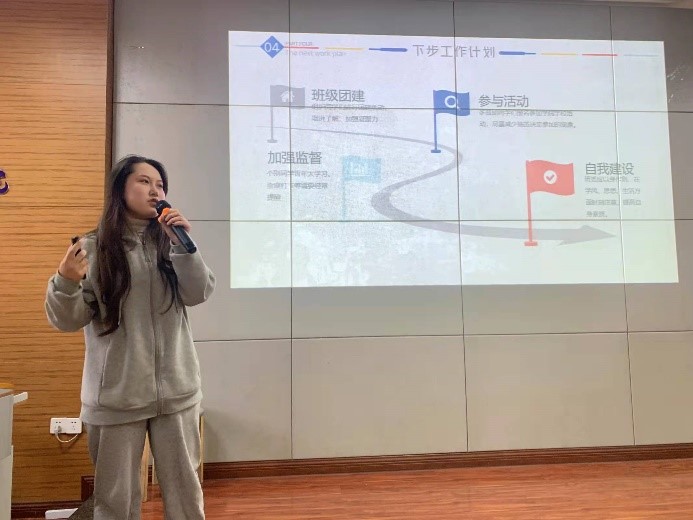 辅导员杨希做总结点评,她充分肯定了本学期各位班委的辛勤付出和班级取得的成绩,同时指出了班级工作中仍存在的不足和相应的整改措施。对于述职报告的汇报情况,她讲道:一份好的述职报告应该分类分层,突出亮点,言语生动,贴合实际,并对日后班委述职的内容板块提出了建议,希望班委能够在每学期的述职报告会上不断提升语言表达、逻辑思维、办公软件运用等多方面的能力,并在每次总结工作会上能充分交流、学习经验、获取反思。最后辅导员杨希从诚信应考、学生安全问题以及国家2022年征兵工作的宣讲等方面对期末工作进行了整体安排。