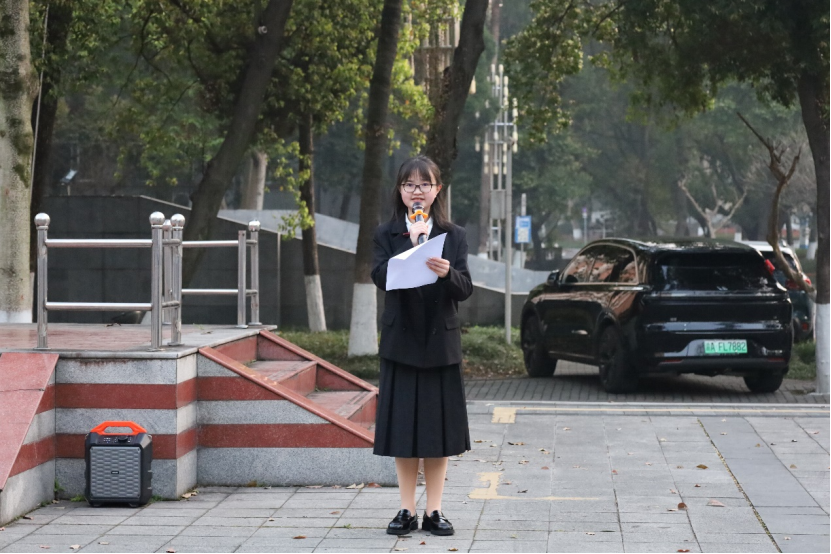 女子国旗班庄严护送五星红旗入场,全体师生行注目礼完成升旗。礼毕,2024级茶学2班学生代表王静怡在国旗下发言。她从求知创新、突破进取、知行合一、团队协作四方面,表达了对新学期的希冀与憧憬,并呼吁同学们以“少年负壮气,奋烈自有时”的豪情,在“明德崇食,至善尚品”的征程中挥洒青春!