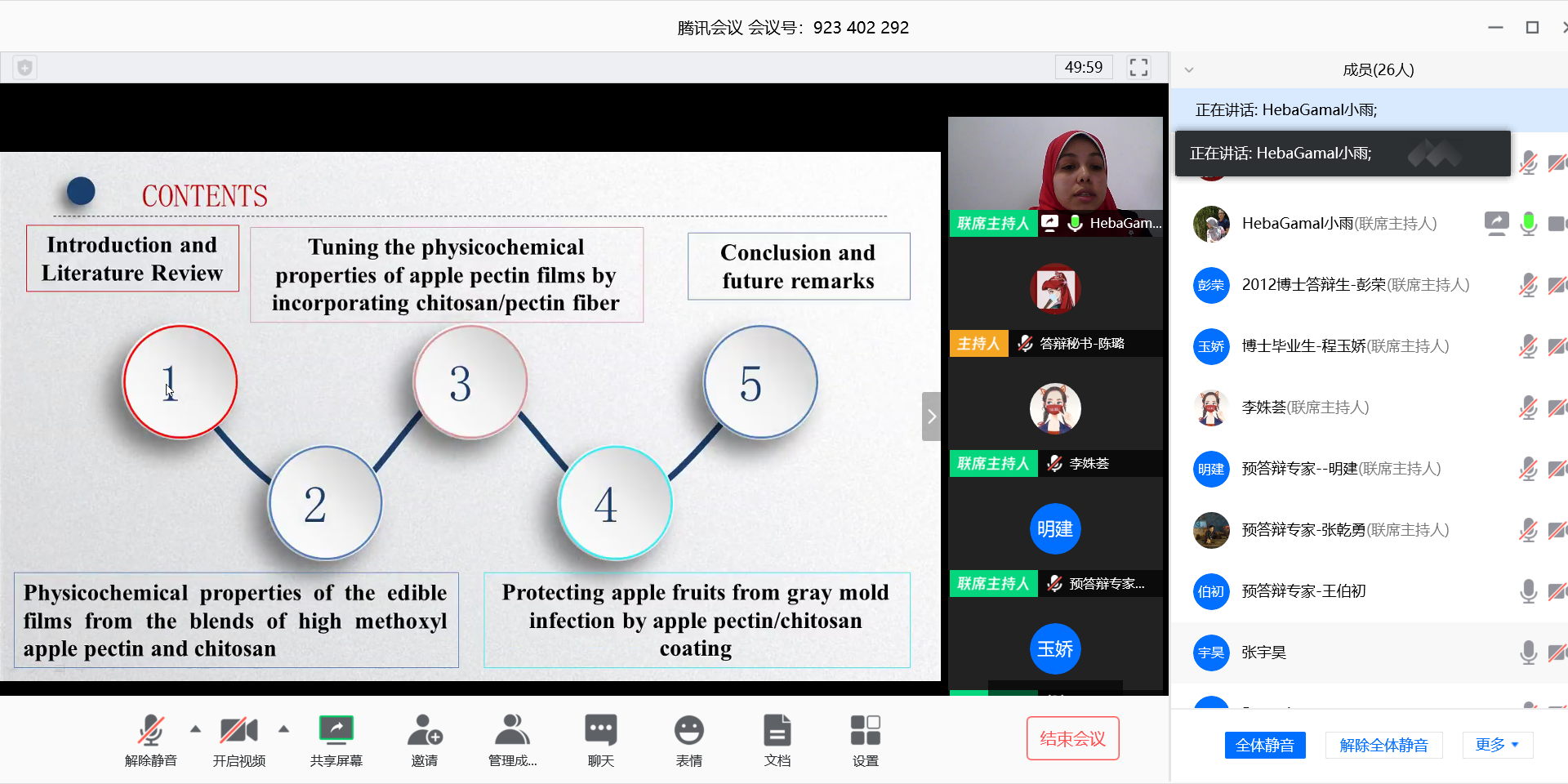 31日,3位博士毕业生进行了预答辩汇报,其中留学博士研究生Heba Gamal Rashwan Younis首先进行了报告,其毕业论文的撰写、评阅、答辩陈述、以及教授的提问均用英文顺利完成。