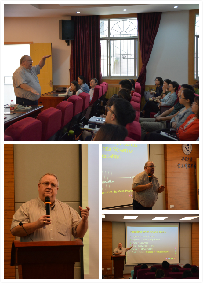 会议伊始,Edgar Chambers Ⅳ教授以新食品的开发为切入点,向同学们介绍了由文化差异导致的不同国家人群对于食品的不同需求。他分享了自己在泰国的所见所闻,并以此为例向同学们详细讲解了新产品的设计思路,强调了食品开发一定要提前考虑到消费者想要什么、需要什么、害怕什么和会选择什么,使自己设计的新产品有“Right to exit”,将目光放眼国际,及时了解当下国际人群对于食品新产品的需求热点,去设计生产兼具健康、方便、环境友好等方向的新型食品。