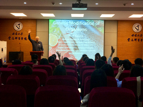 会议伊始,Joe M.Regenstein教授以转基因食品为切入点展开会议内容。他分享了转基因对食品品质影响的看法,并以此为基础讲解了什么是GMO、其培育的下一个阶段如何表达、育种系统中存在的问题以及全球化讨论中对GMO一些关键问题的探讨这四个方面的内容,同时向同学们讲述了转基因食品的安全问题及美国相关领域的教授如何看待该问题。最后,Joe M.Regenstein教授与在座师生共同探讨了关于转基因食品方面的看法。
