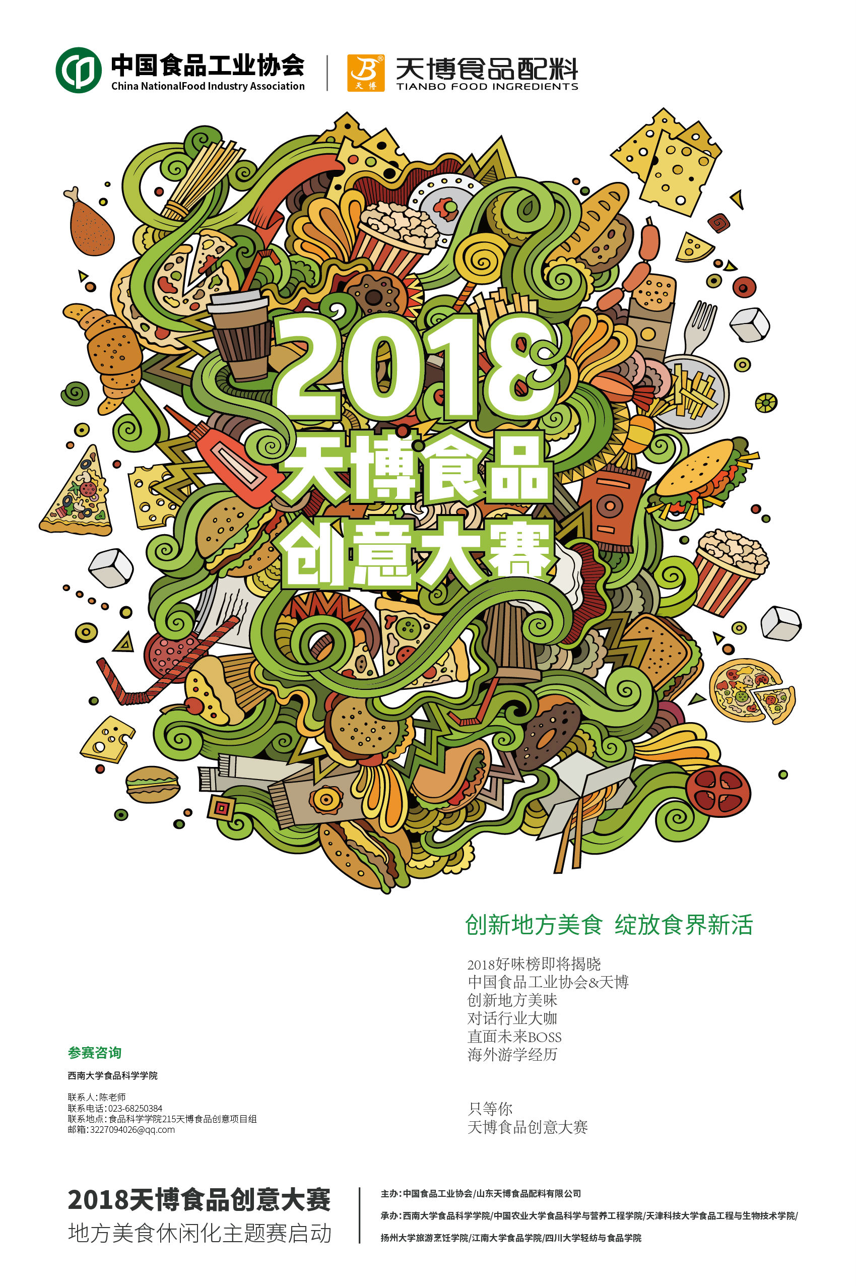 天博食品创意项目组(辅导员办公室215),计划书参赛信息登记表压缩打包(文件以“天博食品创意+负责人+年级+产品名”命名)电子版发至邮箱 [email protected]